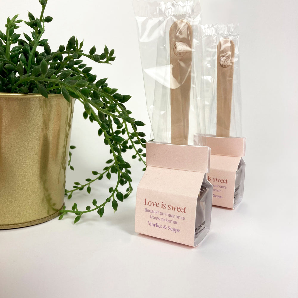 Je plooit deze wikkel heel eenvoudig rond de chocolade spoon. De wikkels worden open meegeleverd met de Choc-o-lait spoons indien je incl. wikkel kiest.