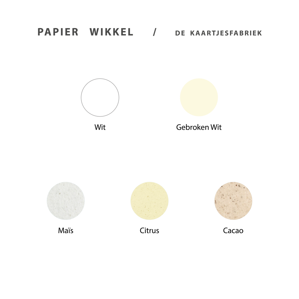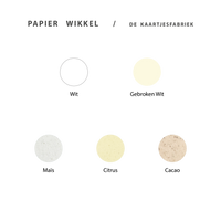 Keuze papier: wit, gebroken wit, crush maïs, crush citrus of crush cacao