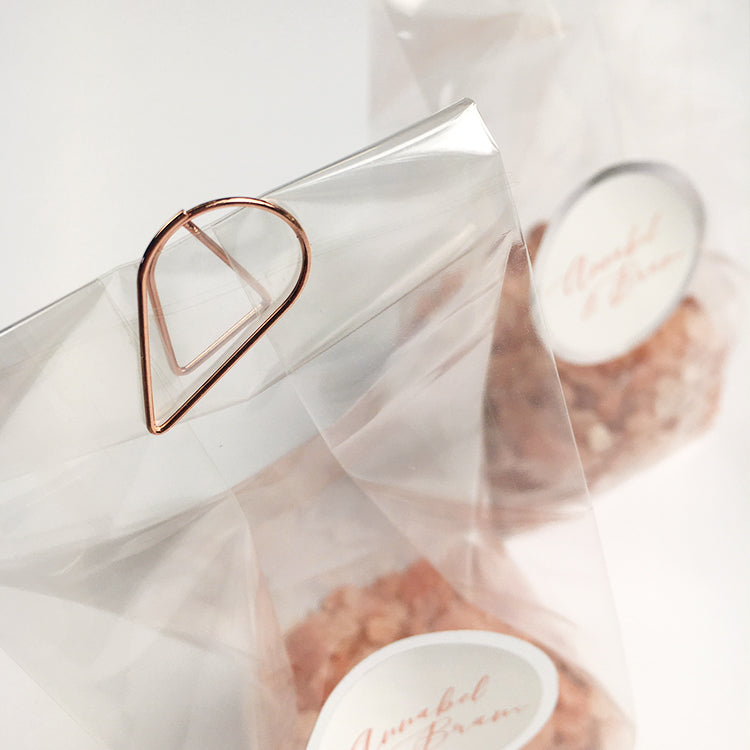 Druppelvormige clips om bijvoorbeeld kaarten bijeen te houden of als sluiting voor bijvoorbeeld zakjes.