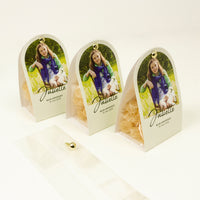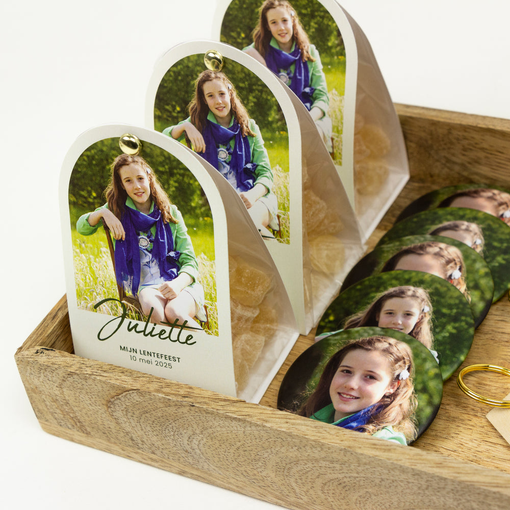 Origineel snoepzakje met personalisatie op voor- en achterzijde. Per snoepzakje is er ook een transparant blokzakje en een gouden splitpen meegeleverd.