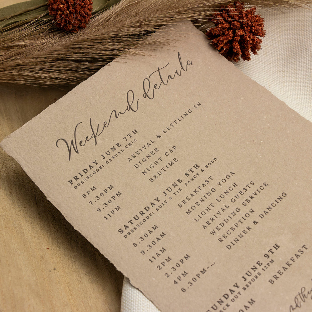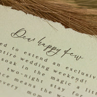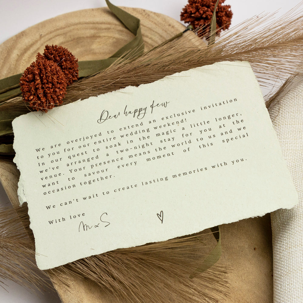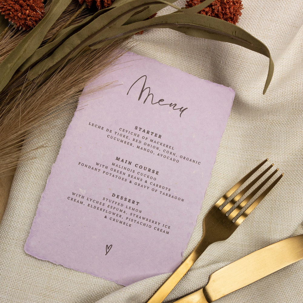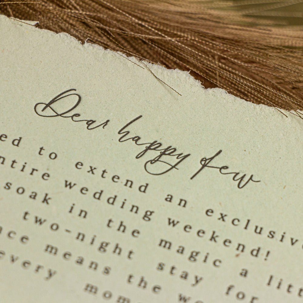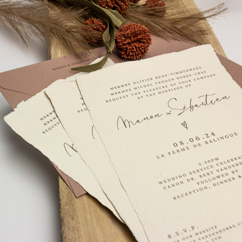 De trouwkaarten van Manon en Sébastien werden op ambachtelijk handgeschept papier gedrukt in letterpress. Er werd gekozen voor verschillende kleuren handgeschept papier voor de verschillende bijlages.