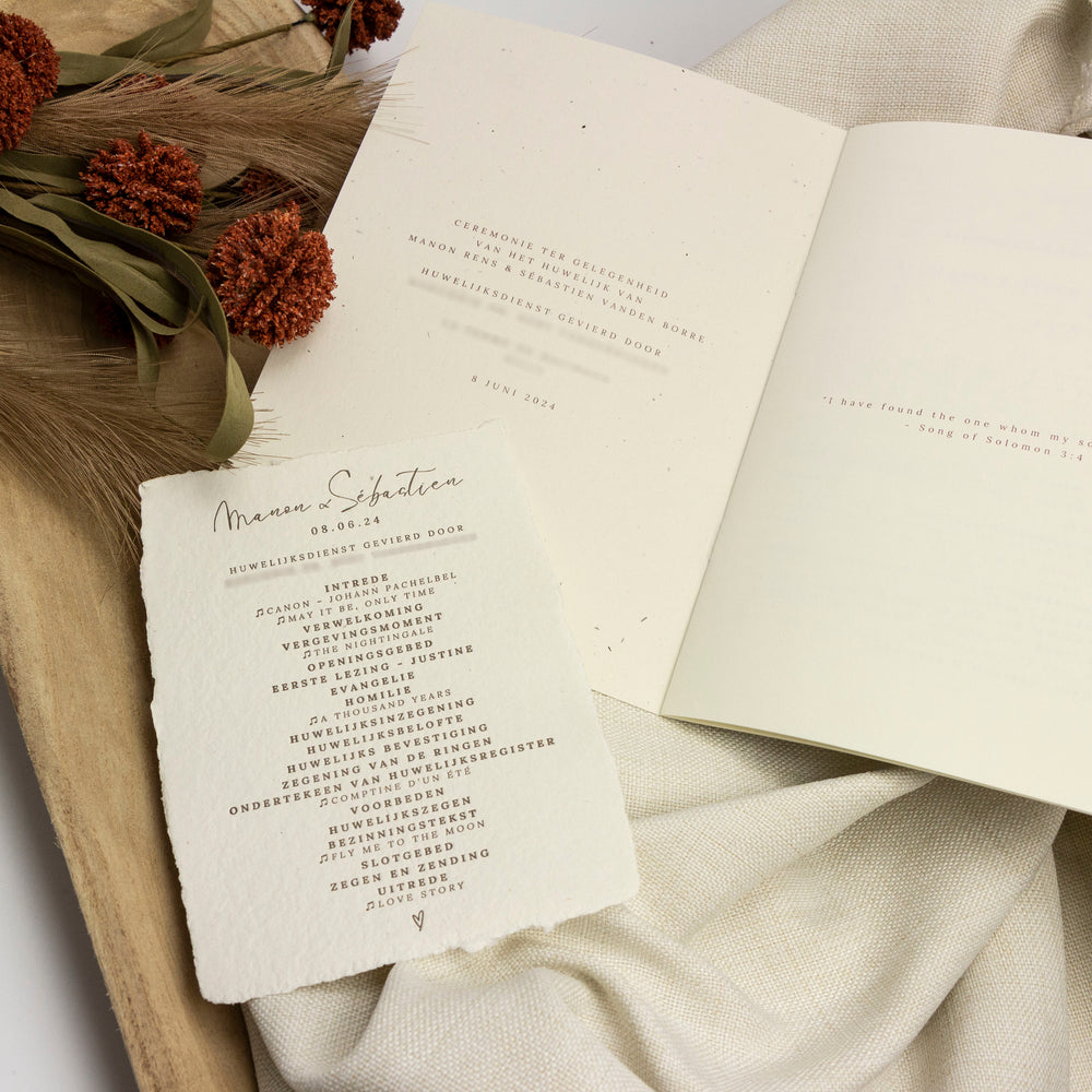 Voor de misviering voorzagen we een boekje met als cover Flora papier en een overzichtje op handgeschept papier.