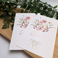 Het geboortekaartje van Rachelle werd digitaal geprint en voorzien van een rosé hotfolie op de voorzijde. De naam en enkele bloemetjes komen in folie.