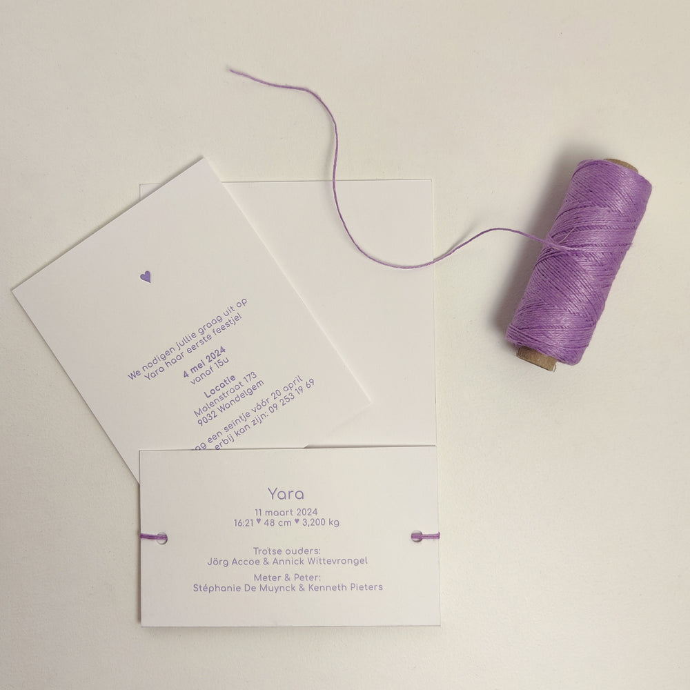 Yara haar geboortekaartje bevat aan de achterzijde een flapje waar je een borrelkaartje in kan steken. Het flapje wordt mooi toegehouden d.m.v. een touwtje of lintje.