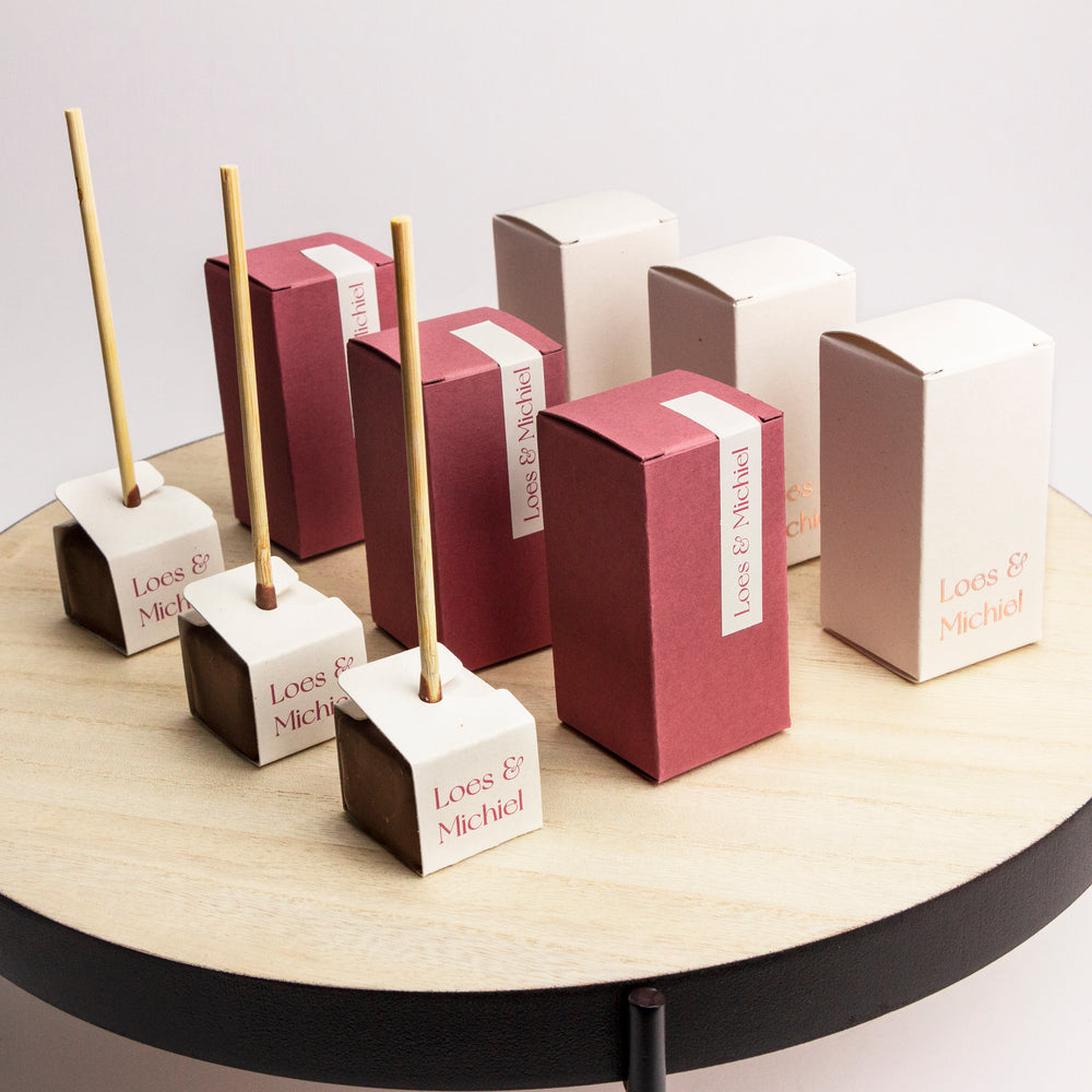 Als attributen voorzagen we Choc-o-lait wikkeltjes voor warme chocolademelk te maken, stickers voor doosjes en rosé plotletters.