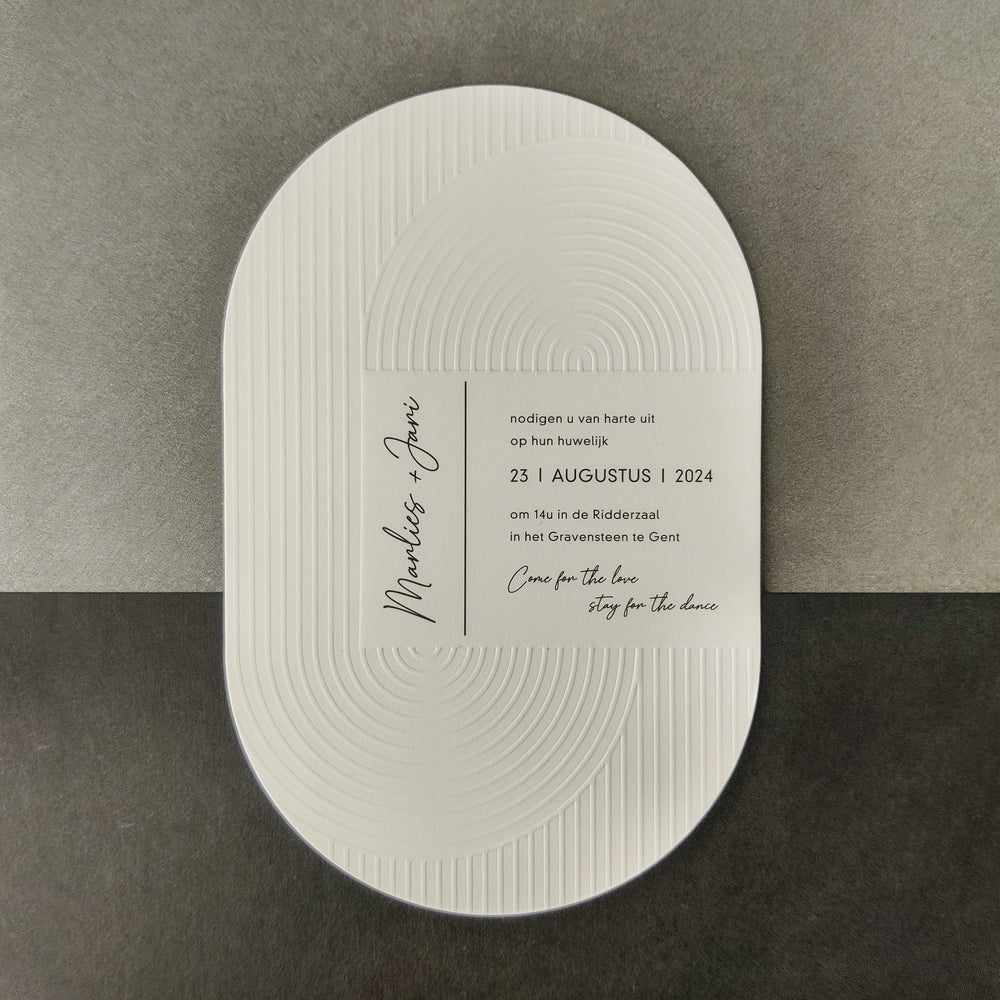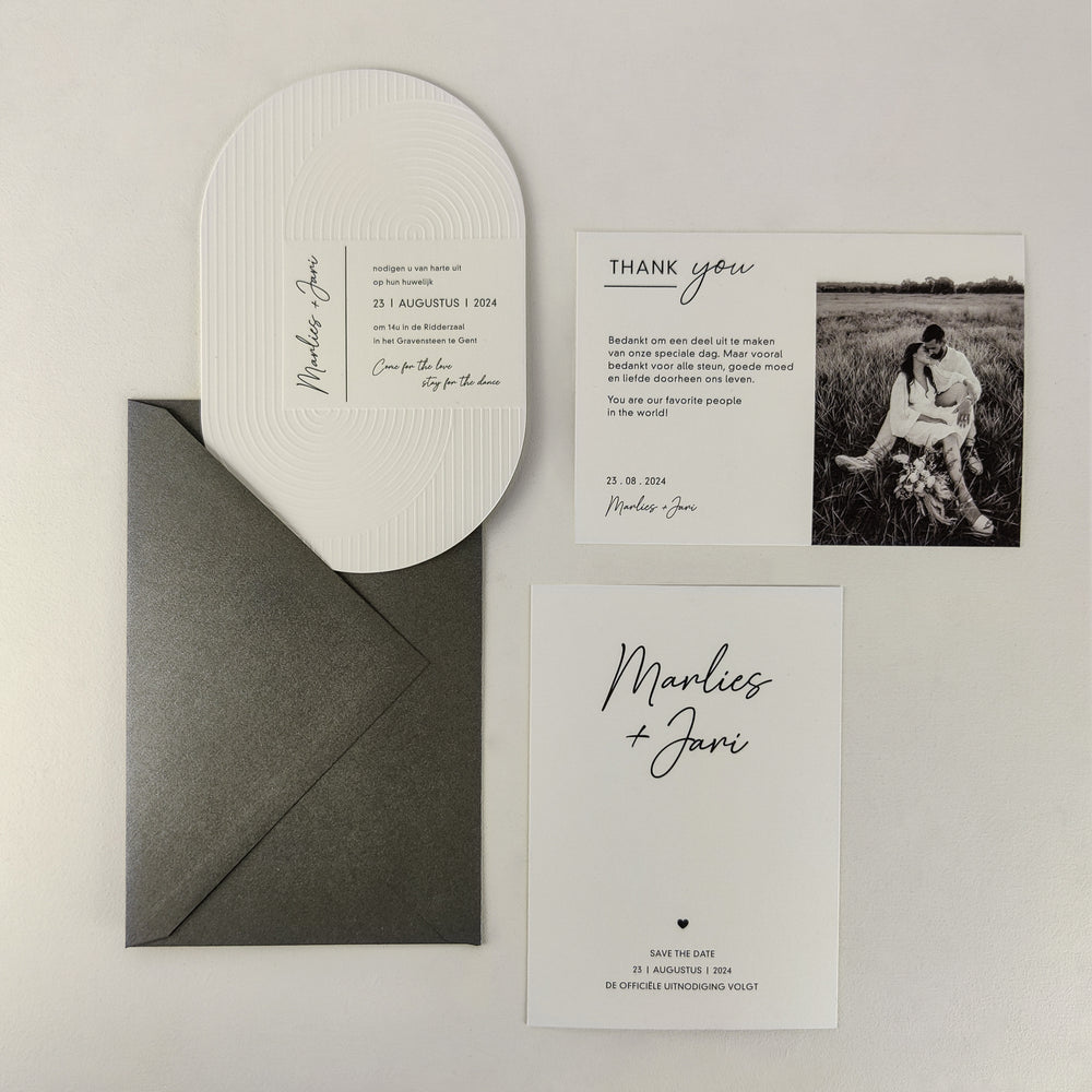 De collectiekaart van Marlies en Jari bestaat uit een kaart die recto digitaal geprint is, vervolgens gepreegd in een leuke abstracte vorm en als laatste uitgekapt in een ovale vorm. We combineerden dit met zilveren enveloppen voor wat meer cachette.