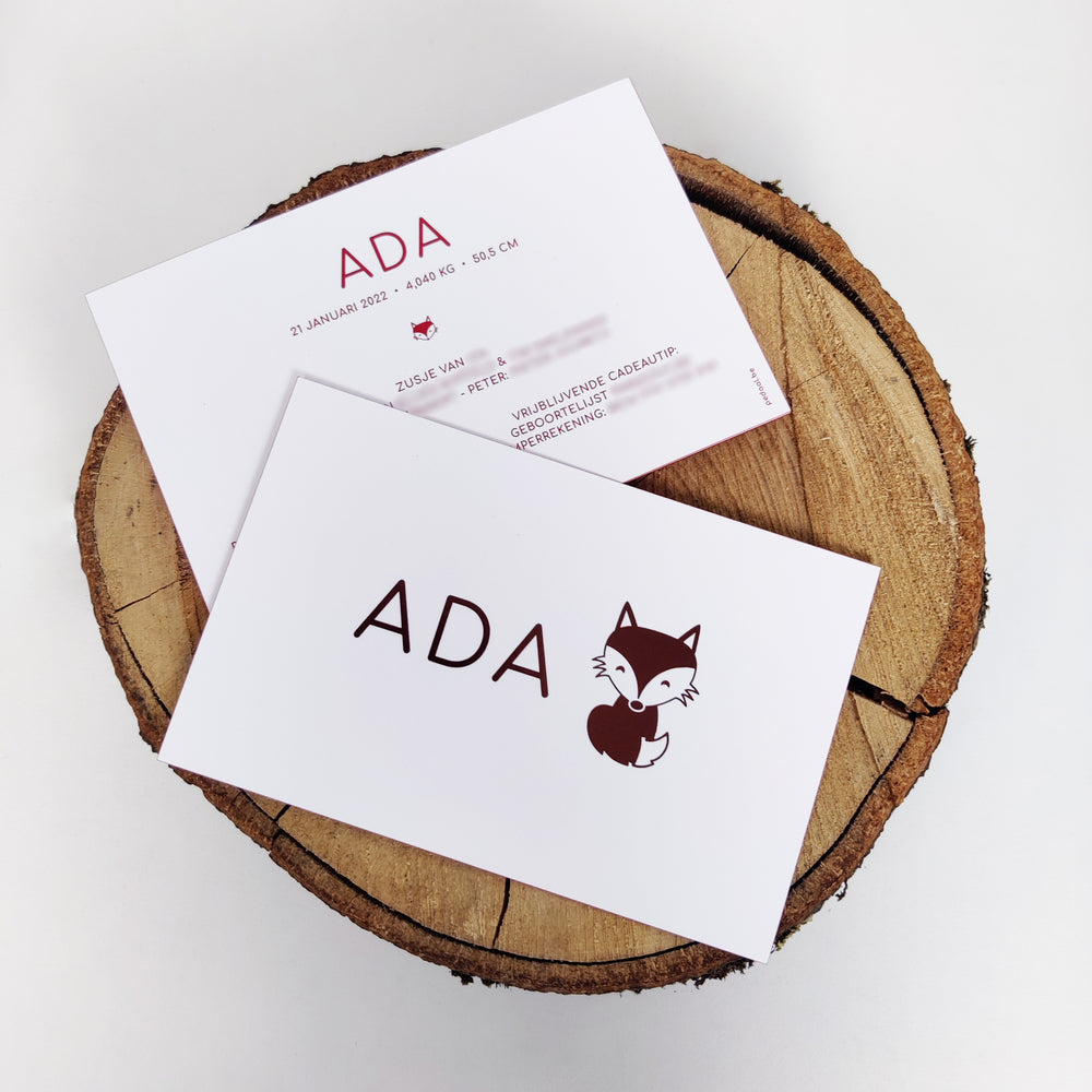 Geboortekaarten met illustratie van een vosje in een rode hotfolie. De verso werd digitaal geprint.