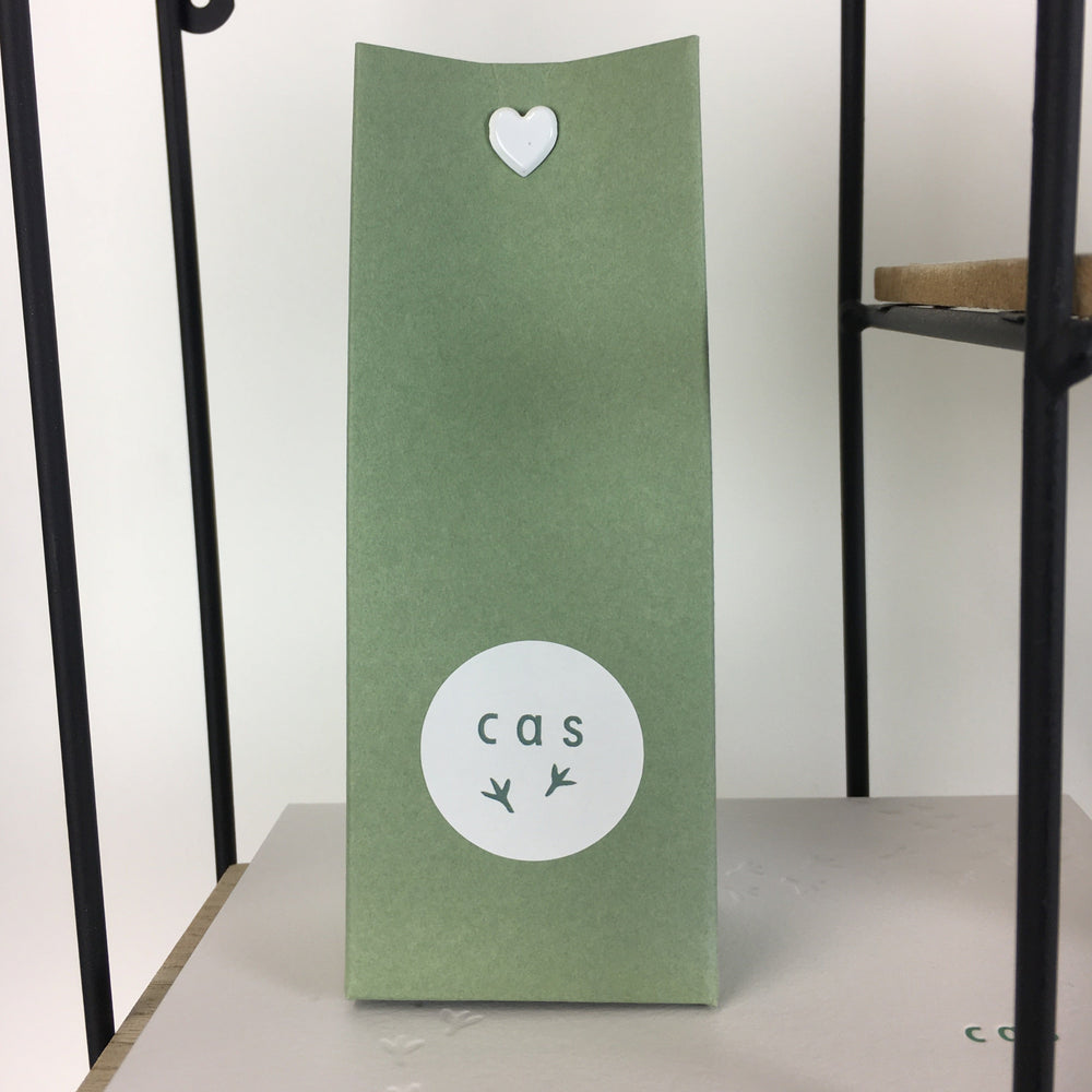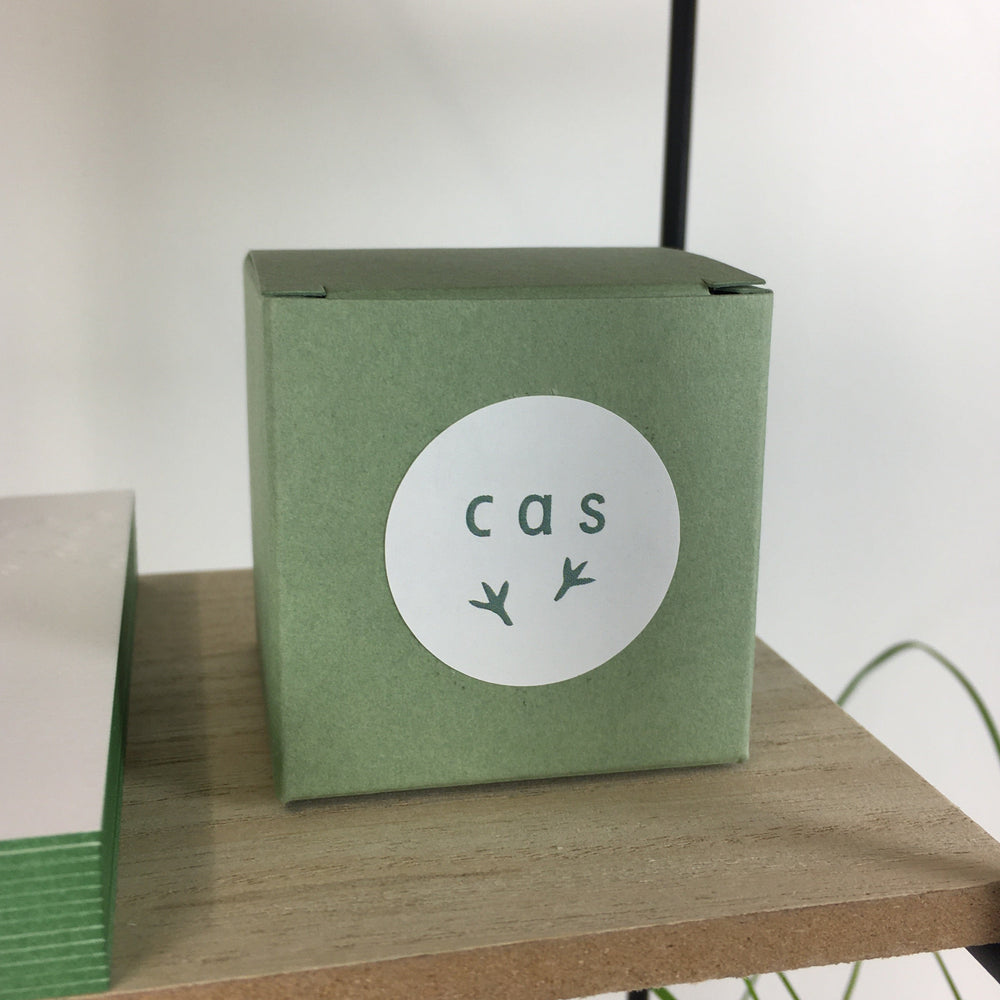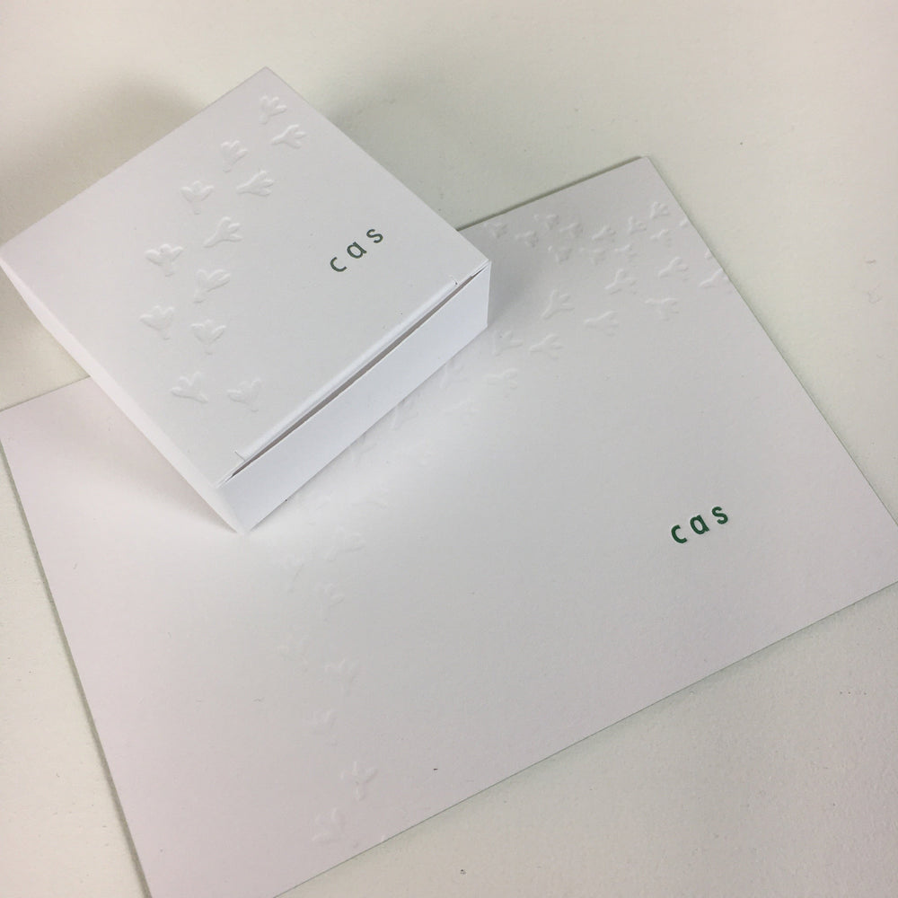 Voor Cas creëerden we een schattig pootafdruk patroon doorheen zijn drukwerk dat werd doorgetrokken op de geboortekaartjes, doosjes en stickers. Op de geboortekaarten werden de pootjes blanco ingedrukt.