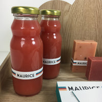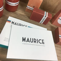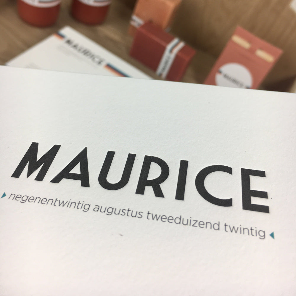 Kleurrijk letterpresskaartje voor Maurice met bijhorende stickers, doosjes en zeepjes.