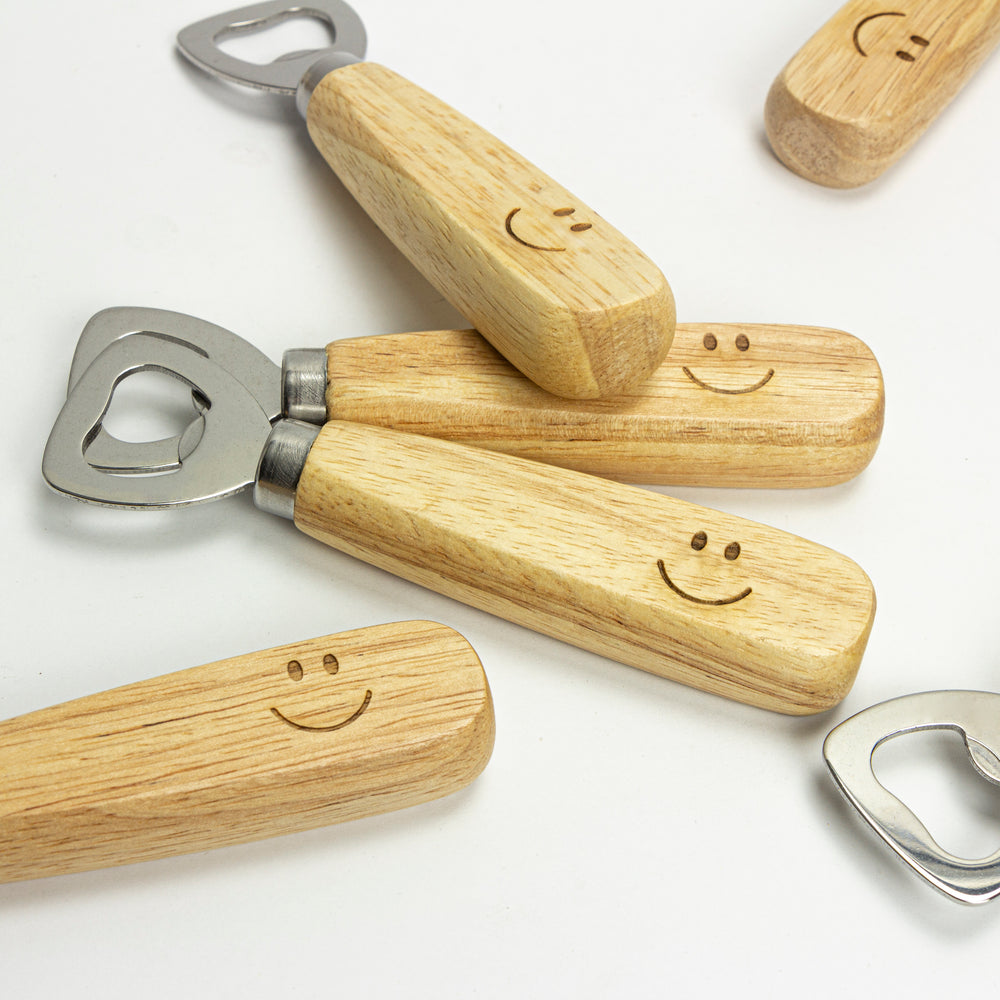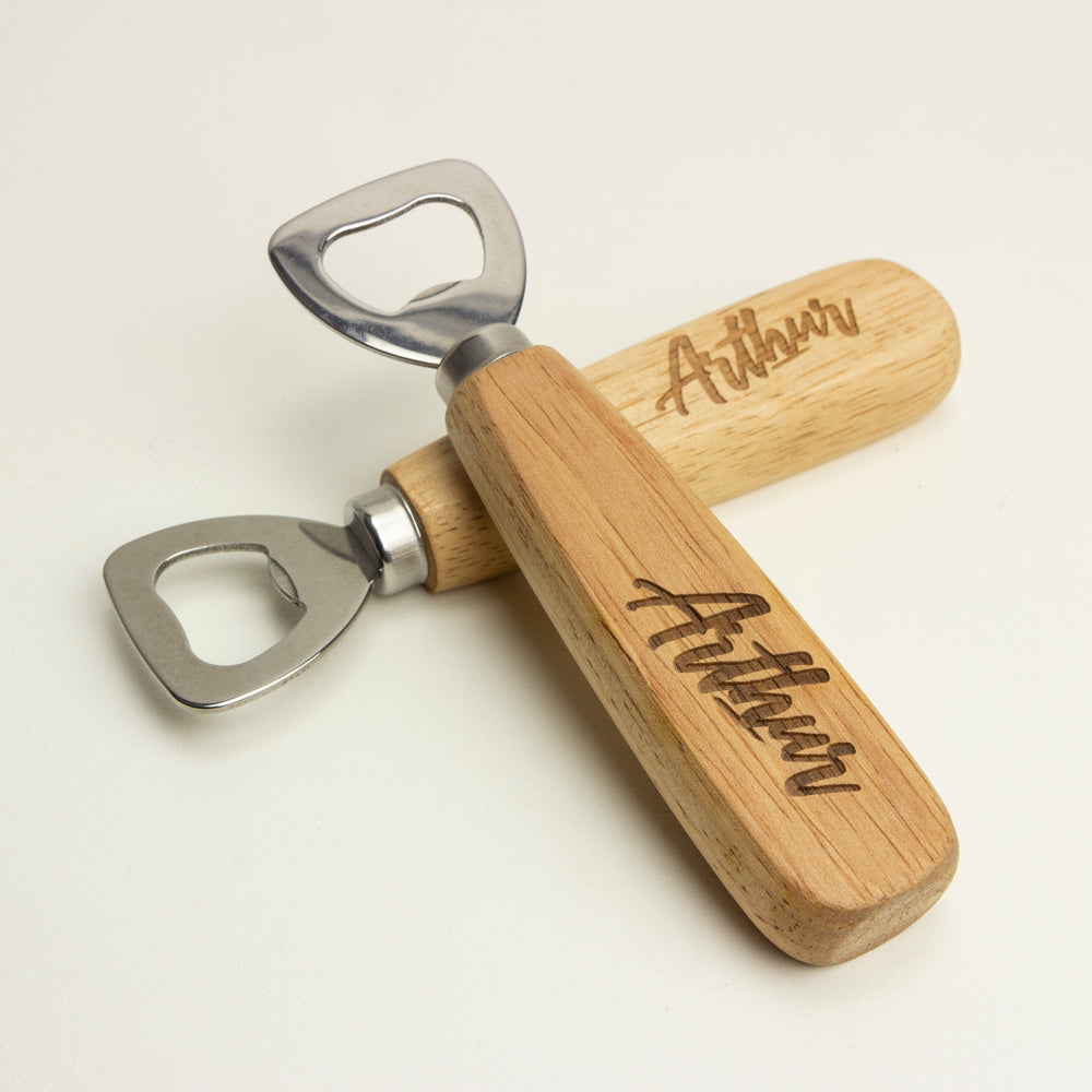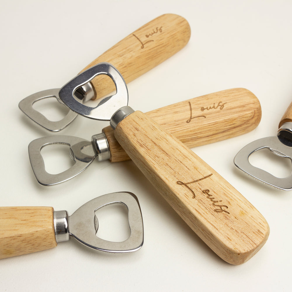 Houten flessenopeners met gravering van naam, tekst of logo.