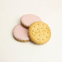 Ronde likkoekjes met glazuur en aardbeimaak. Op elk koekje staat ook een leuke korte quote.