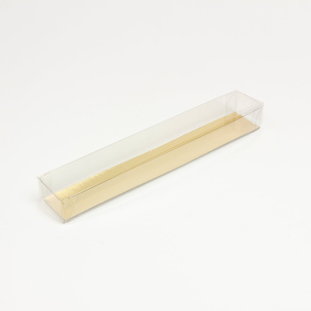 Transparant rechthoekig doosje uit pvc met gouden inlegvel uit karton. Doordat je de inhoud van het doosje kan zien, zorgt dit voor een luchtige touch. Zo kan je ze bijvoorbeeld vullen met verschillende kleuren doopsuiker of snoepjes.