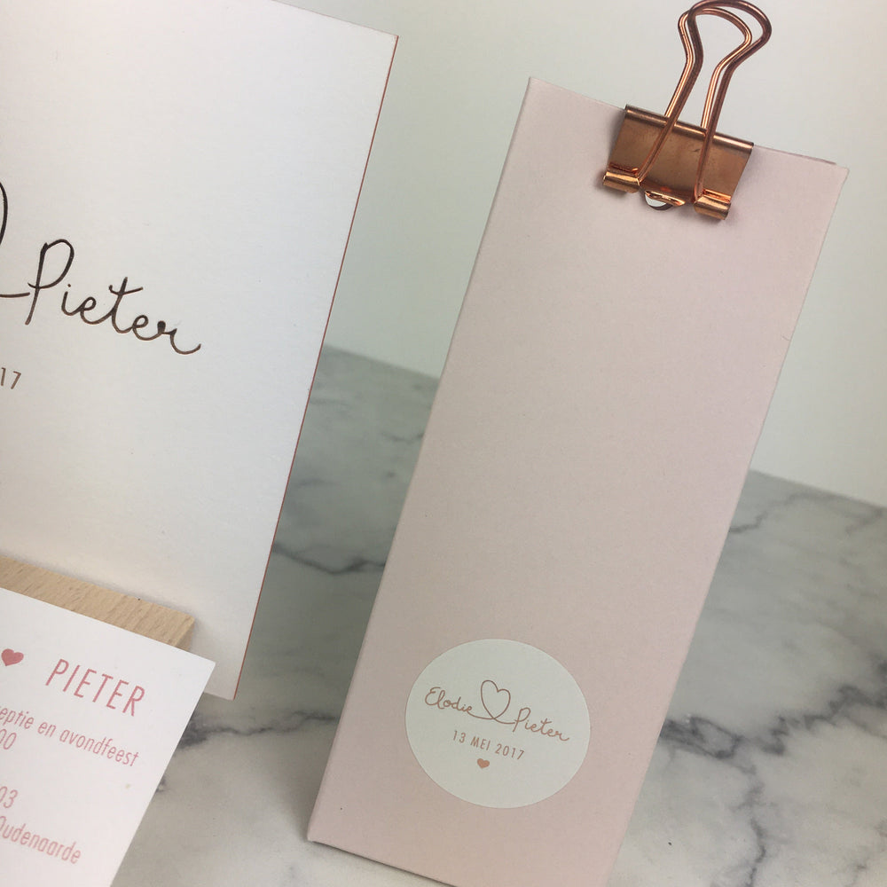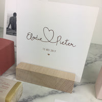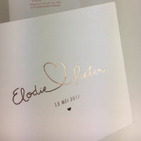 Vierkant trouwkaartje met namen handgeschreven in hotfolie.